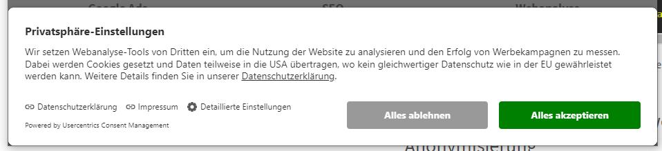 Für höchstmögliche Rechtssicherheit empfehlen wir, zwei gleichwertige Buttons "Alle akzeptieren" und "Alles ablehnen" anzubieten. Das Ablehnen von Cookies sollte nicht aufwändiger sein als das Akzeptieren von Cookies bzw. nicht hinter "Einstellungen" versteckt werden. Derzeit gibt es bereits zahlreiche Beschwerden gegen solche Konstruktionen - auch hier sind bald erste Entscheidungen der Datenschutzbehörden zu erwarten.